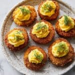 This recipe for Air Fryer Deviled Eggs offers a crispy twist on the classic deviled eggs by breading the egg whites and air frying them to golden perfection. The creamy yolk filling is blended with mayo, pickles, and Dijon mustard, creating a delicious bite-sized appetizer that’s perfect for parties or snack time.