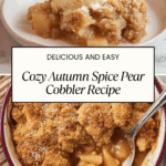 This Autumn Spice Pear Cobbler is a warm, comforting dessert perfect for the fall season. Sweet, tender pears are cooked with spices and sugar to create a luscious filling, topped with a spiced, buttery biscuit-like topping baked until golden brown. The combination of cinnamon, cardamom, ginger, allspice, and nutmeg brings out the rich seasonal flavors, making it an inviting treat to enjoy on a cool autumn day.