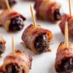 Keywords: bacon wrapped dates, stuffed dates appetizer, goat cheese appetizer, dark chocolate bacon bites, maple syrup glaze, spicy bacon dates