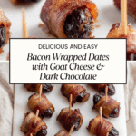 These bacon-wrapped dark chocolate and goat cheese stuffed dates make a perfect sweet and savory appetizer. The combination of creamy goat cheese, rich dark chocolate, and crispy bacon creates an irresistible bite that’s sure to impress your guests.