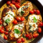 - Add Tomato and Cheese Mixture: Remove the skillet from heat and evenly spread the tomato and mozzarella mixture over the top of the chicken breasts.