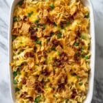 - Add toppings: Sprinkle the crushed potato chips evenly over the casserole, then top with the remaining 1 cup of shredded Cheddar cheese for a crunchy and cheesy crust.