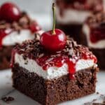 - Garnish and Serve: Optionally decorate with fresh cherries and dark chocolate shavings. Cut brownies into 16 squares and enjoy.