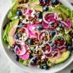 A fresh and vibrant Blueberry Pistachio Spring Salad combining crisp spring mix and butter lettuce with sweet blueberries, crunchy candied pistachios, creamy avocado, tangy pomegranate arils, and salty feta cheese, all brought together with a luscious creamy pomegranate dressing. Perfect as a light lunch or a colorful side dish.