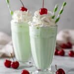 - Serve: Pour the milkshake evenly into the prepared glasses. Top generously with whipped cream and garnish with green sprinkles, chocolate shavings or extra mini chocolate chips, and maraschino cherries if using. Serve immediately to enjoy the thick, cold, and creamy texture.