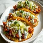 These Buffalo Chicken Smash Burger Tacos are a quick and flavorful weeknight meal featuring spicy buffalo-seasoned ground chicken smashed and cooked directly on tortillas for a crispy, tender texture. Topped with a refreshing cabbage-carrot slaw and creamy ranch dressing, these tacos offer the perfect balance of heat and crunch in under 30 minutes.