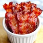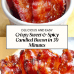 Keywords: candied bacon, sweet bacon, bacon recipe, baked bacon, smoked paprika, caramelized bacon