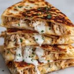 These Cheesy Hot Honey Chicken Quesadillas feature crispy golden tortillas filled with seasoned shredded chicken, melty mozzarella and Monterey Jack cheeses, and a drizzle of sweet and spicy hot honey. Served with a cool and fiery jalapeño cream sauce, this dish offers a perfect balance of heat, sweetness, and creaminess, making it an ideal quick and flavorful American dinner option.