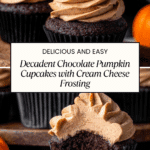 Keywords: chocolate pumpkin cupcakes, pumpkin cupcakes, pumpkin dessert, cream cheese frosting, fall dessert, holiday cupcakes, moist chocolate cupcakes