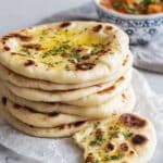 - Step 5: Brush warm naan with more melted butter and sprinkle with chopped parsley or cilantro if desired. Serve immediately.