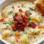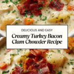 This Creamy Clam Chowder is a comforting and hearty soup featuring tender clams, crispy turkey bacon, and a velvety broth made from milk, half-and-half, and chicken broth. Perfect for a cozy meal, it combines the savory flavors of seafood and smoky bacon with the soft texture of diced potatoes and aromatic vegetables.