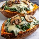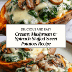 Delight in these creamy mushroom and spinach stuffed sweet potatoes, a comforting and nutritious dish perfect for a wholesome meal. Baked sweet potatoes are filled with a savory mixture of sautéed mushrooms, spinach, garlic, and cream cheese, then topped with gooey melted shredded cheese for a rich, hearty flavor.