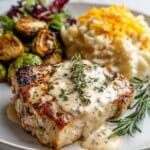 - Cook the Pork Chops: Season the pork chops generously with salt and pepper. Heat olive oil in a large skillet over medium-high heat. Add the pork chops and sear them for 4 to 5 minutes per side until they develop a golden brown crust and are cooked through. Remove the chops from the skillet and set aside, keeping the skillet on medium heat. Pour in the chicken broth, scraping up any browned bits from the bottom to add flavor. Stir in the heavy cream, Dijon mustard, dried thyme, and garlic powder. Season with additional salt and pepper to taste. Allow the sauce to simmer and thicken for about 3 to 4 minutes. Return the pork chops to the skillet, spoon the creamy sauce over them, and cook for another 2 minutes to heat through and meld the flavors.