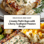 Keywords: creamy pork chops, scalloped potatoes, cheesy potatoes, comfort food, dinner recipe, pork chops recipe