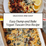 Keywords: vegan orzo, Tuscan pasta, dump and bake, one dish meal, vegan dinner, Mediterranean orzo, easy vegan recipes