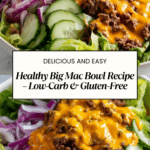Enjoy all the iconic flavors of a Big Mac in a healthier, gluten-free bowl. This deconstructed recipe features seasoned ground beef, crisp romaine lettuce, fresh cherry tomatoes, red onion, diced dill pickles, shredded cheddar cheese, and a creamy homemade special sauce. Ready in just 25 minutes, it’s perfect for a quick weeknight dinner or meal prep lunch with low carbs and high protein.