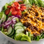 Enjoy all the iconic flavors of a Big Mac in a healthier, gluten-free bowl. This deconstructed recipe features seasoned ground beef, crisp romaine lettuce, fresh cherry tomatoes, red onion, diced dill pickles, shredded cheddar cheese, and a creamy homemade special sauce. Ready in just 25 minutes, it’s perfect for a quick weeknight dinner or meal prep lunch with low carbs and high protein.