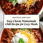 This easy classic homemade chili is a comforting and flavorful dish perfect for any weeknight dinner. Packed with hearty beef, beans, and a blend of spices, it warms you up and satisfies every time.