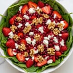 This fresh and vibrant strawberry and pomegranate salad combines tender spinach and peppery arugula with juicy strawberries, tangy feta cheese, crunchy walnuts, and sweet-tart pomegranate seeds. Tossed in a rich balsamic vinaigrette, it’s a colorful and nutritious salad perfect for a light lunch or a refreshing side dish.