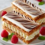 The classic French Mille-Feuille, also known as Napoleon, is a delightful layered pastry featuring crisp puff pastry and smooth vanilla pastry cream. This elegant dessert is perfect for special occasions or a refined treat to impress your guests.