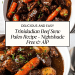 This Trinidadian Beef Stew is a flavorful AIP and paleo-friendly adaptation of the traditional Trinidadian Stew Beef. The beef is marinated in a vibrant green seasoning made from cilantro, lime, chives, and thyme, then browned with coconut sugar before being simmered alongside tender carrots and optional grain-free dumplings. This nightshade-free recipe delivers rich Caribbean flavors without compromise, perfect for those following strict dietary guidelines.