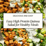 This High Protein Salad is a refreshing and nutritious option featuring protein-rich quinoa and chickpeas combined with fresh vegetables and tangy feta cheese. Perfect for a quick and healthy meal, it’s seasoned with a simple lemon and olive oil dressing that enhances the vibrant flavors.