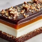 - Assemble the Layers: Spoon the prepared cheesecake filling evenly over the set chocolate layer. Pour 1 cup of caramel sauce over the cheesecake layer and smooth it out gently with a spatula to cover the entire surface.