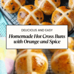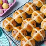 Deliciously spiced Hot Cross Buns with a tender crumb, studded with raisins and a hint of orange zest. These traditional Easter buns feature a signature cross made from a simple flour icing and are glazed with a sweet orange syrup for a shiny finish. Perfect for a festive breakfast or teatime treat.