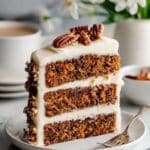 Store the carrot cake covered in the refrigerator for up to 4 days. For longer storage, wrap tightly and freeze for up to 2 months. When ready to enjoy, thaw overnight in the refrigerator and bring to room temperature before serving. Leftover frosted cake can be gently warmed in the microwave for 10-15 seconds if desired.
