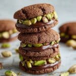 These irresistible Chocolate-Pistachio Sandwich Cookies combine rich dark chocolate, crunchy roasted pistachios, and a creamy pistachio-flavored frosting to create a decadent treat perfect for any occasion. Delicately soft on the inside with a crackly exterior, these sandwich cookies are wonderfully complemented by a luscious, smooth frosting rolled in chopped pistachios for added texture and flavor.