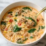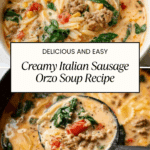 A comforting and hearty Italian Sausage Orzo Soup featuring browned Italian sausage, aromatics, tender orzo pasta, creamy broth, and fresh spinach. This easy stovetop soup combines robust flavors with a creamy texture, perfect for a satisfying meal any day of the week.