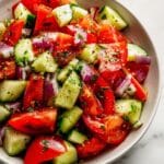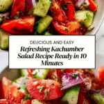 Kachumber Salad is a refreshing and simple Indian salad made with chopped cucumber, tomatoes, and onions. Lightly seasoned with salt, pepper, and tangy lemon juice, it’s perfect as a side dish or a healthy snack, prepared in just 10 minutes.