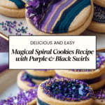 Magical Spiral Cookies are visually stunning, colorful cookies featuring layers of purple, black, and white dough spiraled together. These buttery, sweet, and soft-textured treats are perfect for parties or as a whimsical snack. The combination of almond and vanilla extracts adds a delightful aroma and flavor, while sprinkles give a playful finish to these charming homemade cookies.