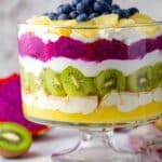 This vibrant Mardi Gras Trifle is a delightful layered dessert featuring fluffy angel food cake, tangy lemon curd, creamy lemon-flavored cream cheese mousse, and a colorful medley of fresh tropical fruits including kiwi, pineapple, blueberries, and dragon fruit. Perfect for festive gatherings, this no-bake trifle combines bright citrus flavors with fresh fruit for a light and refreshing treat.