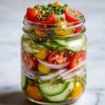 This fresh and tangy salad combines marinated cucumbers, onions, and tomatoes for a vibrant side dish. It’s quick to prepare and thrives on simple ingredients tossed in a flavorful vinegar dressing.