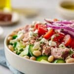 This Mediterranean Tuna Salad combines flaky tuna, creamy cannellini beans, and crisp vegetables tossed in a bright red wine vinaigrette. With fresh cucumber, grape tomatoes, and tangy feta, it’s a quick and satisfying no-cook meal perfect for busy weeknights or meal prep.