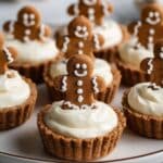 Delightful No-Bake Gingerbread Cheesecake Cups featuring a spiced gingerbread crust and creamy cheesecake filling, topped with whipped cream and festive gingerbread decorations. Perfect for holiday gatherings or winter treats, these cups require no baking and come together quickly.