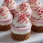 Delight in these No-Bake Pink Velvet Cheesecake Bites that offer creamy, luscious texture combined with a buttery graham cracker crust. Perfect for a sweet treat without the oven, these cheesecake bites are beautifully pink, topped with whipped cream and sprinkles for a festive touch.