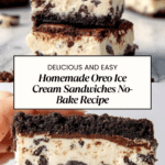 Keywords: cookies and cream ice cream sandwiches, easy summer dessert, homemade ice cream sandwich recipe, ice cream sandwiches, no bake dessert, oreo crust, oreo ice cream sandwiches