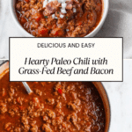This Paleo Chili is a hearty and comforting dish made with grass-fed ground beef, spicy Italian sausage, and crispy bacon. Packed with flavorful diced tomatoes, rich beef stock, and a blend of aromatic spices, it simmers slowly to develop a deep, satisfying taste. This recipe is Whole30 compliant and perfect for those seeking a nutritious, paleo-friendly chili without beans.