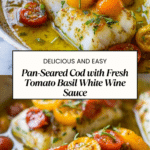 Keywords: cod recipe, pan-seared cod, white wine sauce, tomato basil sauce, healthy seafood, Mediterranean fish recipe