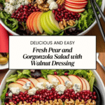A fresh and flavorful Pear and Gorgonzola Salad featuring a tangy pear vinaigrette dressing, paired with crisp mixed greens, sweet pears, crunchy walnuts, and creamy Gorgonzola cheese for a perfect balance of textures and tastes. Ready in just 15 minutes, this salad is ideal for a light lunch or an elegant side dish.