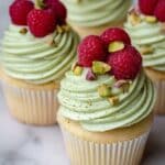 - Frost and Decorate: Once cooled, spread cream cheese frosting on each cupcake, then garnish with additional fresh raspberries and a sprinkle of chopped pistachios.