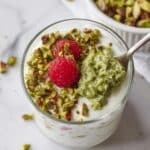 This Pistachio Overnight Oats recipe is a nutritious and delicious make-ahead breakfast featuring creamy pistachio butter blended with quick oats, chia seeds, and sweetened with maple syrup. It is a plant-based, dairy-free option that’s perfect for busy mornings. Topped with non-dairy yogurt, fresh raspberries, and chopped pistachios, it offers a delightful texture and flavor contrast with vibrant color and crunch.
