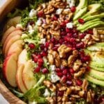 - Assemble the Salad: In a large salad bowl, combine the assorted salad greens and curly endive. Add chopped apples or pears, sliced avocados, and pomegranate seeds. Sprinkle crumbled cheese over the top, then add the cooled candied nuts and seeds. Gently toss to combine, layering ingredients first for a pretty presentation.