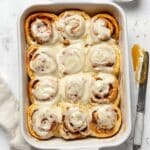 Store leftover cinnamon rolls covered at room temperature for up to 2 days or in the refrigerator for up to 5 days. Reheat gently in the microwave or oven before serving to refresh the texture. The frosting can also be stored separately in the fridge.