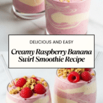 A refreshing and creamy Raspberry Banana Swirl Smoothie that combines the natural sweetness of ripe bananas with the tartness of raspberries for a perfectly balanced, healthy drink. Topped with crunchy granola and fresh or frozen berries, this smoothie makes an ideal quick breakfast or snack.