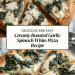 Keywords: roasted garlic pizza, spinach white pizza, vegetarian pizza, homemade pizza dough, white pizza recipe