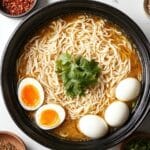 - Serve: Ladle ramen into bowls and top each with halved boiled eggs. Gently stir to combine toppings evenly before enjoying hot.
