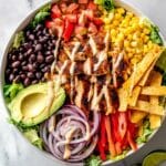- Assemble the Salad: On a plate or in a bowl, layer chopped green leaf lettuce, sliced chicken, diced tomatoes, black beans, sliced red bell pepper, sliced avocado, corn, and sliced red onion. Top with tortilla strips and garnish with fresh cilantro. Serve with lime wedges and drizzle with the prepared spicy ranch dressing before eating.